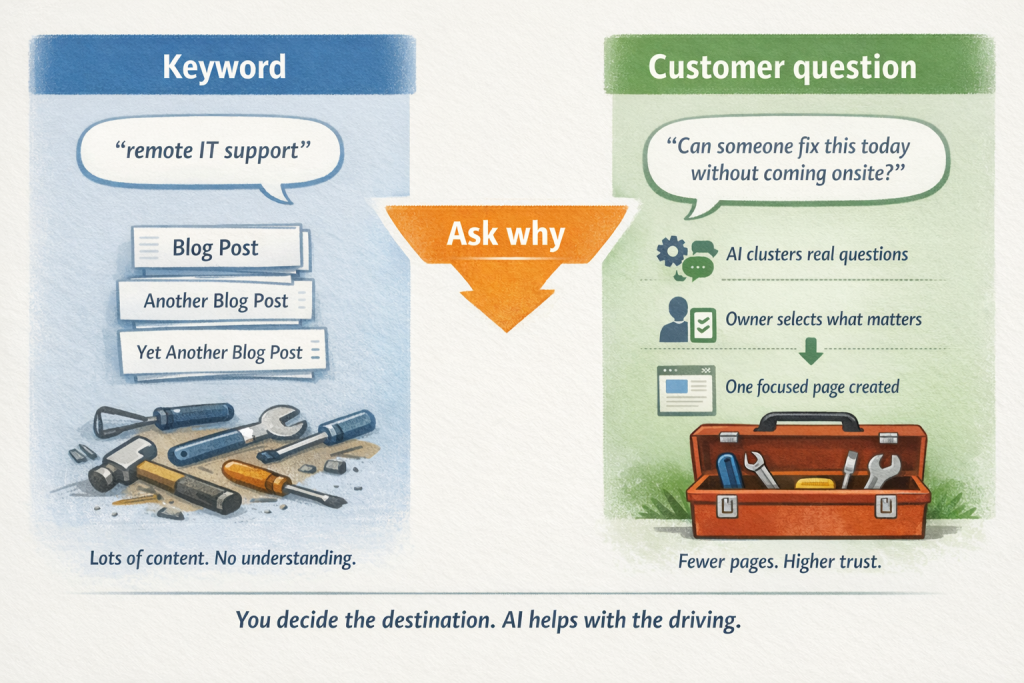 SEO advice often collapses into keyword chasing, and AI makes that temptation worse because it can spin endless variations around a phrase without understanding why someone searched in the first place. That’s like stocking every tool imaginable without knowing what’s broken.